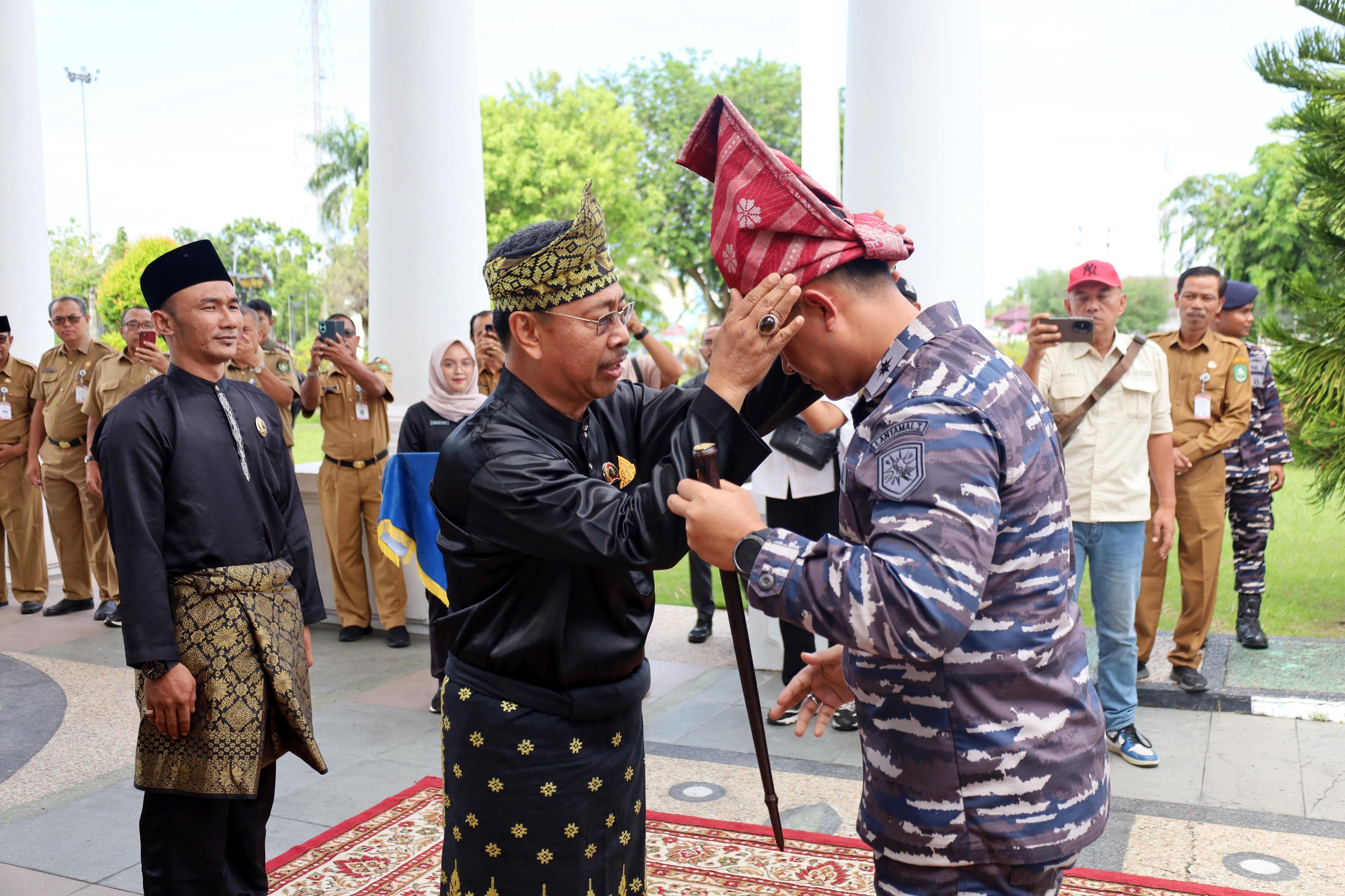TNI AL, Bengkalis,- Hangat dan penuh penghormatan, Wakil Bupati Bengkalis Dr. H. Bagus Santoso bersama Forkopimda Kabupaten Bengkalis sambut kedatangan Danlanal Dumai Kolonel Laut (P) Abdul Haris S.E., M.M.D.S., beserta rombongan. Dengan tradisi khas tabuhan kompang serta pemasangan tanjak, Danlanal Dumai disambut di Wisma Daerah Sri Mahkota Bengkalis, Senin (19/5/2025).