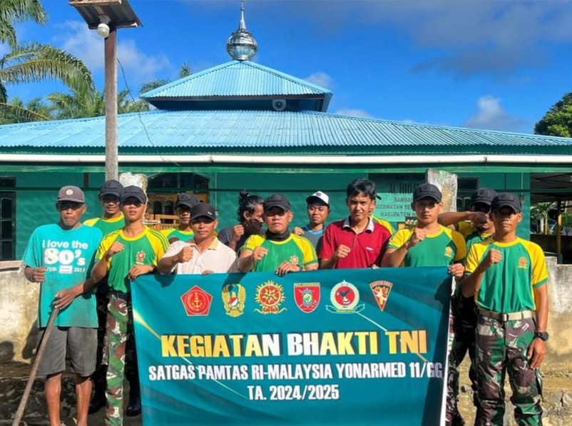 Kegiatan ini bertujuan untuk menciptakan lingkungan ibadah yang bersih dan nyaman bagi masyarakat, sekaligus memperkuat hubungan baik antara Satgas dan warga di wilayah perbatasan. Gotong royong ini mencerminkan semangat kebersamaan serta kepedulian terhadap fasilitas umum yang menjadi pusat aktivitas keagamaan masyarakat.