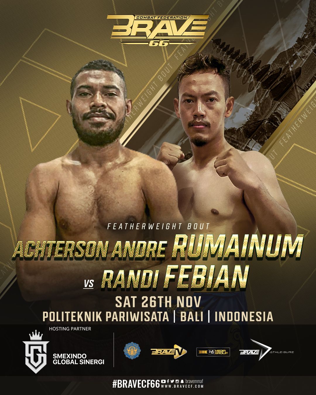 Dalam laga pembuka BRAVE CF 66, Achterson Andre Rumainum dan Randi Febian yang sama sama dari Indonesia akan melakukan debut profesional mereka. Achterson Andre Rumainum yang berusia 27 tahun adalah mantan petarung K-1 yang berlatih di Papua Top Team dan sasana Proximo dan akan memulai karir MMA-nya di kelas 65kg. Meskipun Randi Febian memiliki latar belakang K1, ia juga mantan juara Provinsi Sambo, atlet Han Academy Malang akan mengandalkan semua pengetahuan dan keterampilannya untuk berlaga di debut MMA profesionalnya.