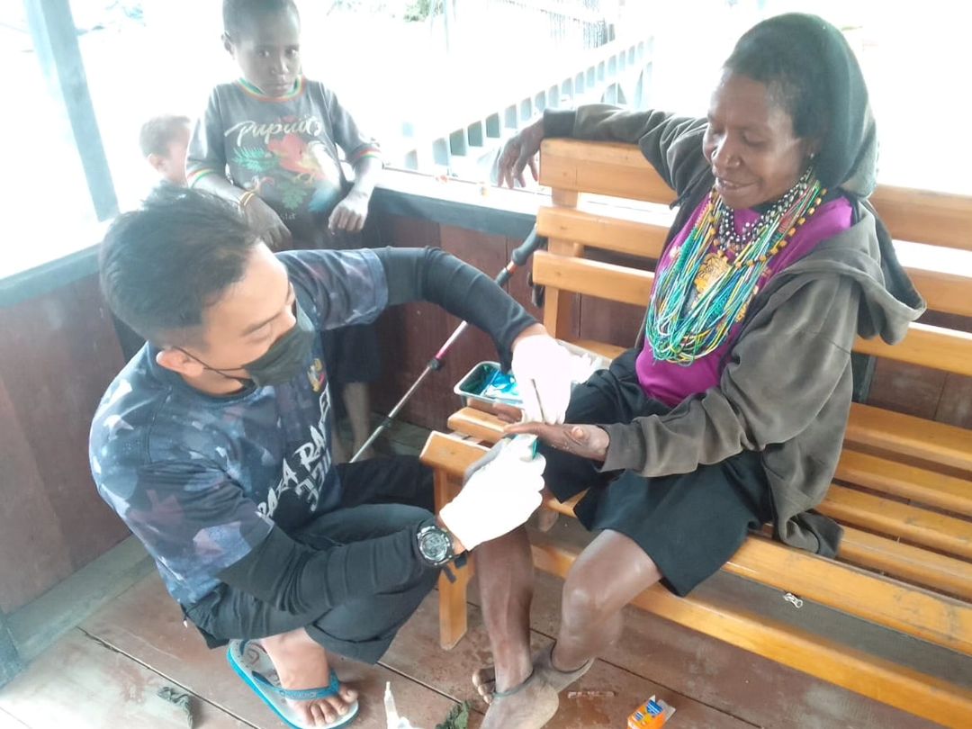 Tak butuh waktu lama, Serda Ojang, personel kesehatan di pos Halo Doc Kampung Mamba segera memberikan penanganan terhadap mama Hanah Sani. “Mama, ini luka ditangan Mama sudah infeksi, jadi saya kasih bersih dulu baru diobati ya”, ucap Ojang dengan ramah.
