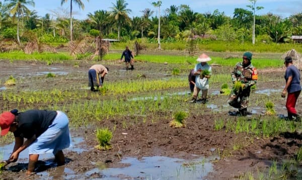 Dengan tangan penuh lumpur, Serka Julkarnain tak ragu ikut menanam bibit padi secara manual, berbaur bersama para petani yang bekerja keras di sawah.