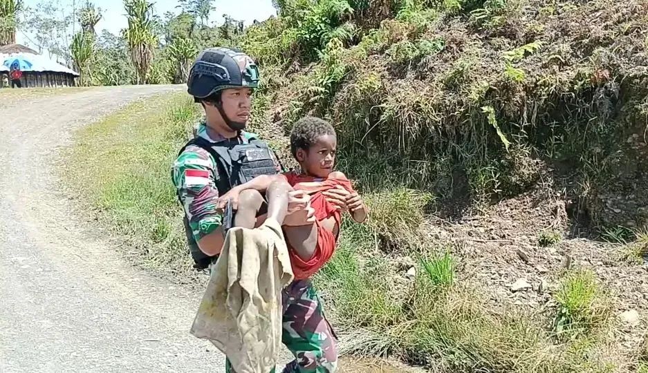 MetropolitanPost.id – Terluka akibat terkena pecahan kaca saat bermain, Satgas Satuan Organik Yonif R 303/SSM Kostrad menolong mengobati Adi (5) Warga Kp. Jigunggi, Distrik Megeabume, Kab. Puncak Papua, Senin (16/1/2023).