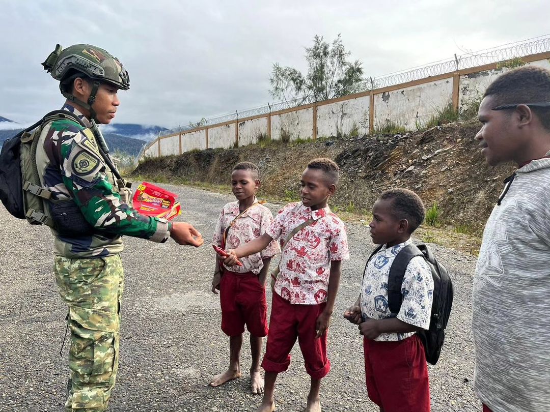 MetropolitanPost.id – Wujud perhatian dan cinta kasih terhadap anak-anak sekitar, Satgas Yonif 509 Kostrad dari Pos Holomama bagikan snack saat anak anak berangkat ke sekolah. Anak-anak tersebut nampak bersemangat meskipun tanpa alas kaki. Kamis (18/04/2024).