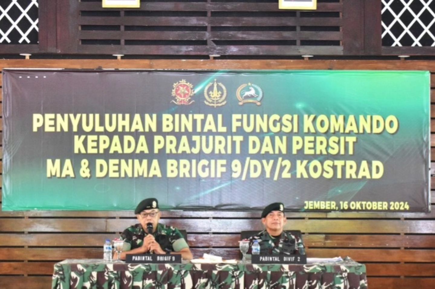 Prajurit dan Persit Denma Brigif 9/DY/2 Kostrad menerima penyuluhan Bintal Fungsi Komando dari Tim Pembinaan Mental Divisi Infanteri 2 Kostrad yaitu Mayor Inf I Gusti Agung Ketut Pramita, bertempat di Aula Sudirman, Kecamatan Patrang, Kabupaten Jember, Jawa Timur. Rabu (16/10/2024).