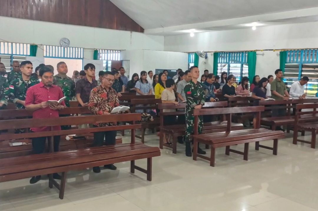 Satgas Pamtas Mobile RI-PNG Yonif 503/Mayangkara Koops Habema laksanakan Ibadah minggu nasrani rutin di Gereja Kristen Indonesia Betel (GKI Betel), Kota Kenyam Kabupaten Nduga Papua. Minggu (13/10/2024).