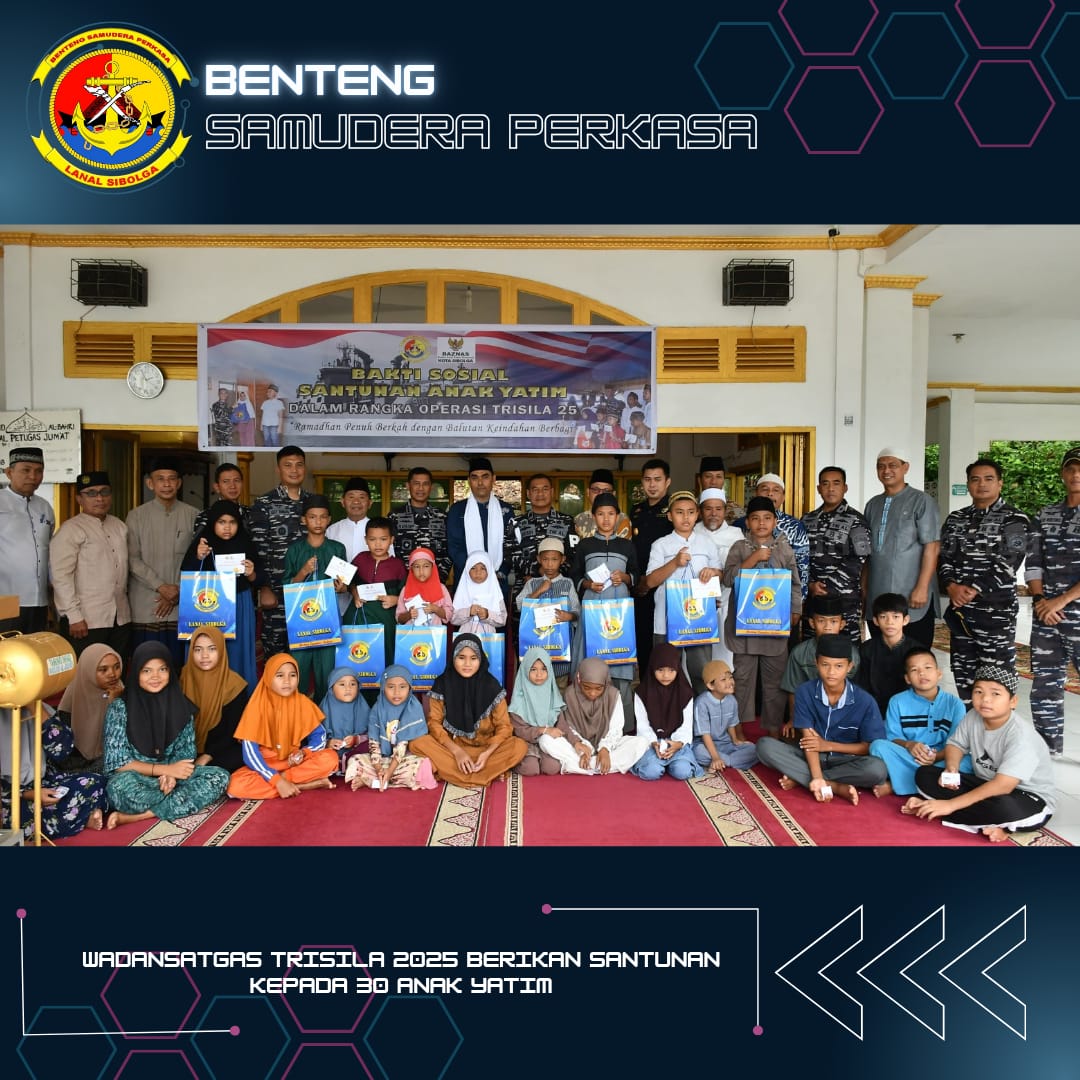 TNI AL, Sibolga,- Wakil Komandan Satuan Tugas (Wadansatgas) Trisila 2025 Kolonel Laut (P) Yusup Yanto, M.Tr. Hanla., M.M., CTMP., menunjukkan kepedulian sosialnya dengan memberikan santunan kepada 30 anak yatim di Masjid Al-Bahri, Pelabuhan Pelindo, Sibolga Sambas, Kota Sibolga, Jum’at (14/03/2025).