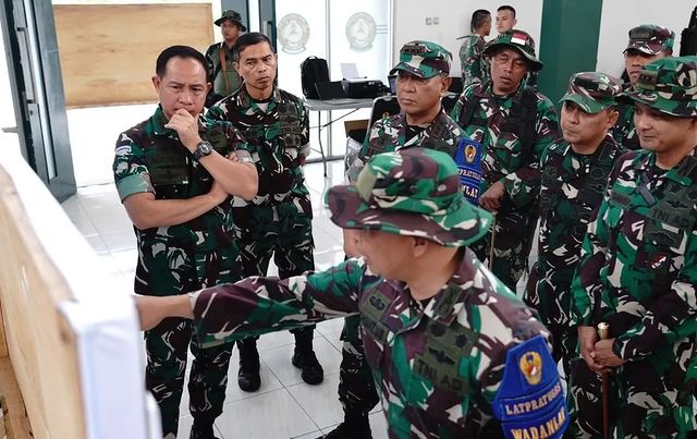 Wakasad, yang didampingi Danpusdikif Pussenif dan staf latihan, kemudian meninjau alat perlengkapan yang digunakan dalam latihan, termasuk yang akan dibawa prajurit Yonif PR 330/Tri Darma dalam penugasan operasi nantinya. (Penkostrad).