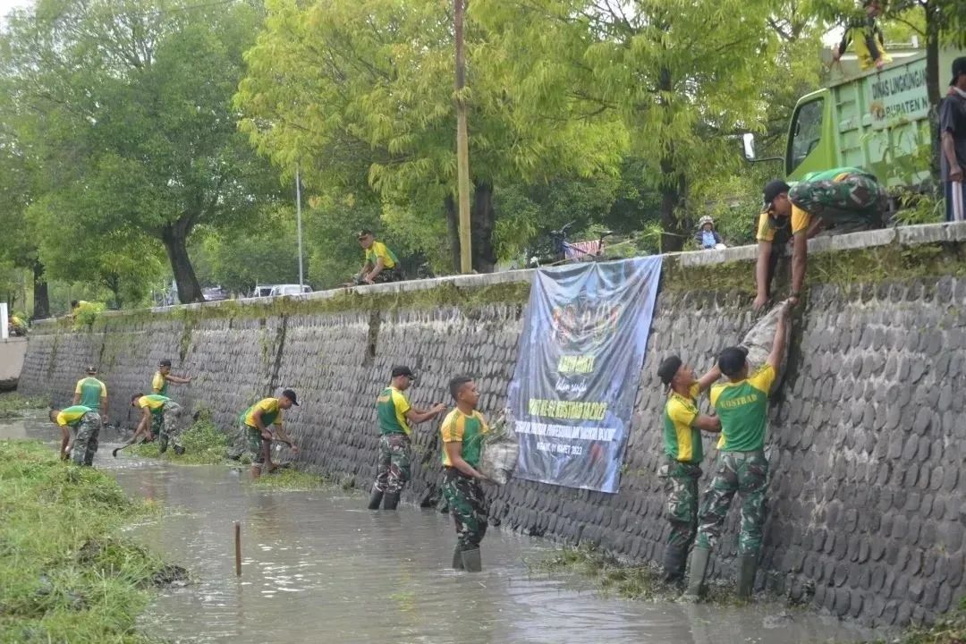 Kali ini puluhan Anggota Yonarmed 12/176/AY/2/2 Kostrad melaksanakan pembersihan Sungai di Jl.siliwangi Ds. Grudo, Kec. Ngawi, Kab. Ngawi, untuk kenyamanan bersama. (28/02/2023).