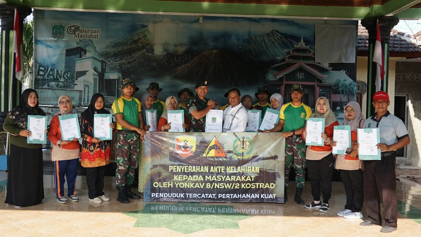 Dalam rangka menyambut HUT ke-75 Kavaleri TNI AD, prajurit Yonkav 8/NSW/2 Kostrad menyerahkan 70 akta kelahiran secara gratis kepada masyarakat di Pasuruan, Senin (28/10/2024).