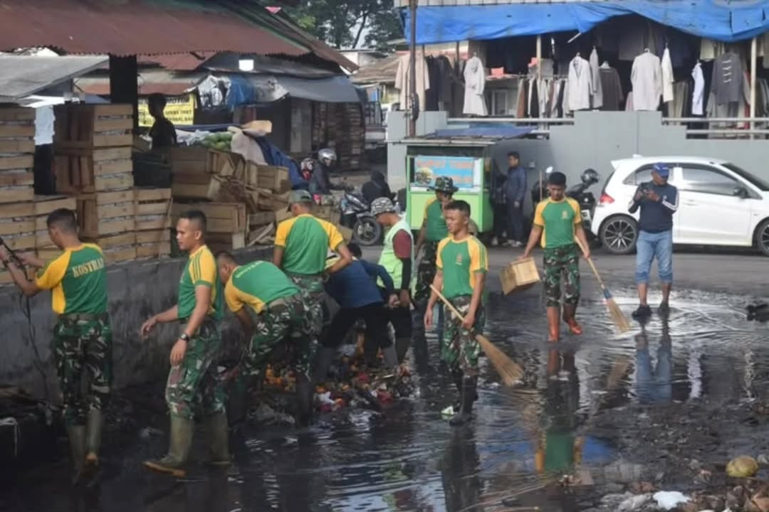 Bersama masyarakat setempat, prajurit Yonzipur 9 Kostrad bahu-membahu membersihkan lingkungan pasar demi menciptakan suasana yang lebih nyaman dan sehat bagi pedagang serta pembeli.