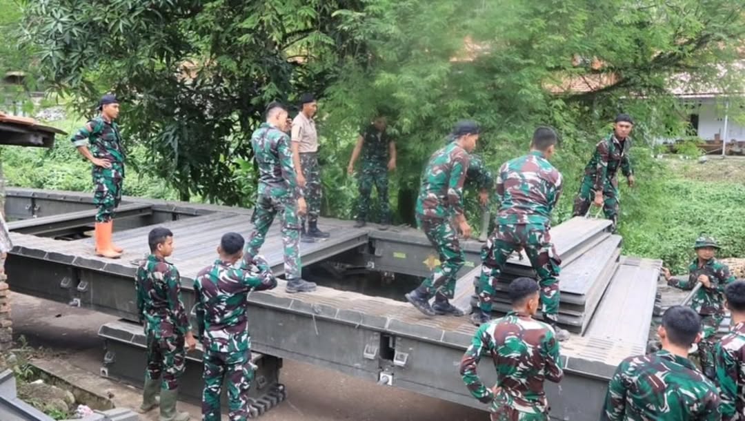 Karawang – Prajurit Yonzipur 9 Kostrad berhasil melaksanakan pemasangan jembatan Modular General Bridge (MGB) di wilayah Sanggabuana, Karawang, untuk memulihkan akses jalan yang tertutup akibat tanah longsor pasca banjir. Senin (9/12/ 2024).