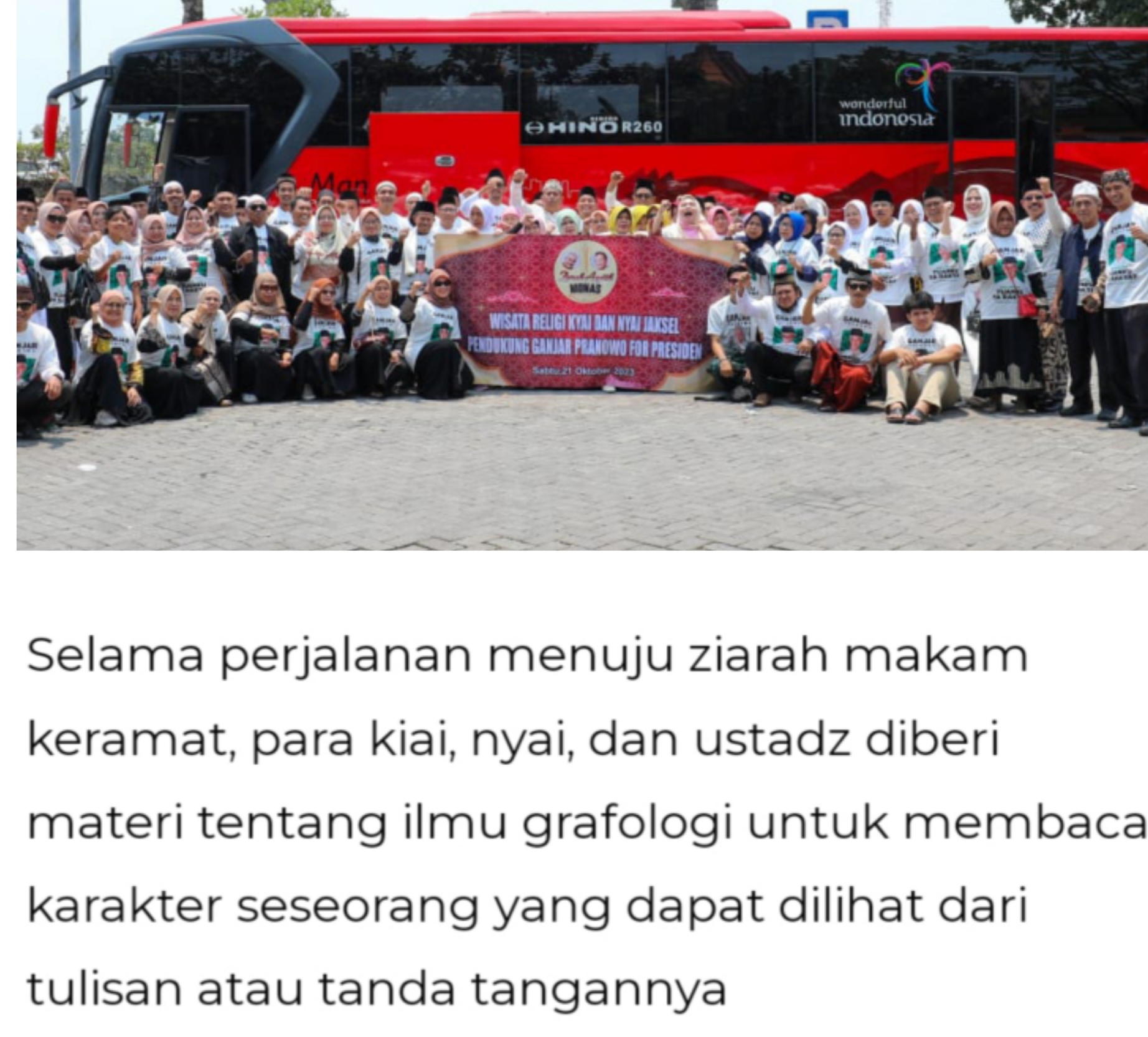 Selama perjalanan wisata religi apalagi saat menuju ziarah makam keramat, para Kiyai, Nyai dan Ustadz diberi berbagai materi utamanya meteri tentang ilmu grafologi guna untuk membaca karakter/kejiawaan seseorang yang dapat dilihat/dirasakan baik melalui dari tulisan, melalui tanda tangan dan sejenisnya.